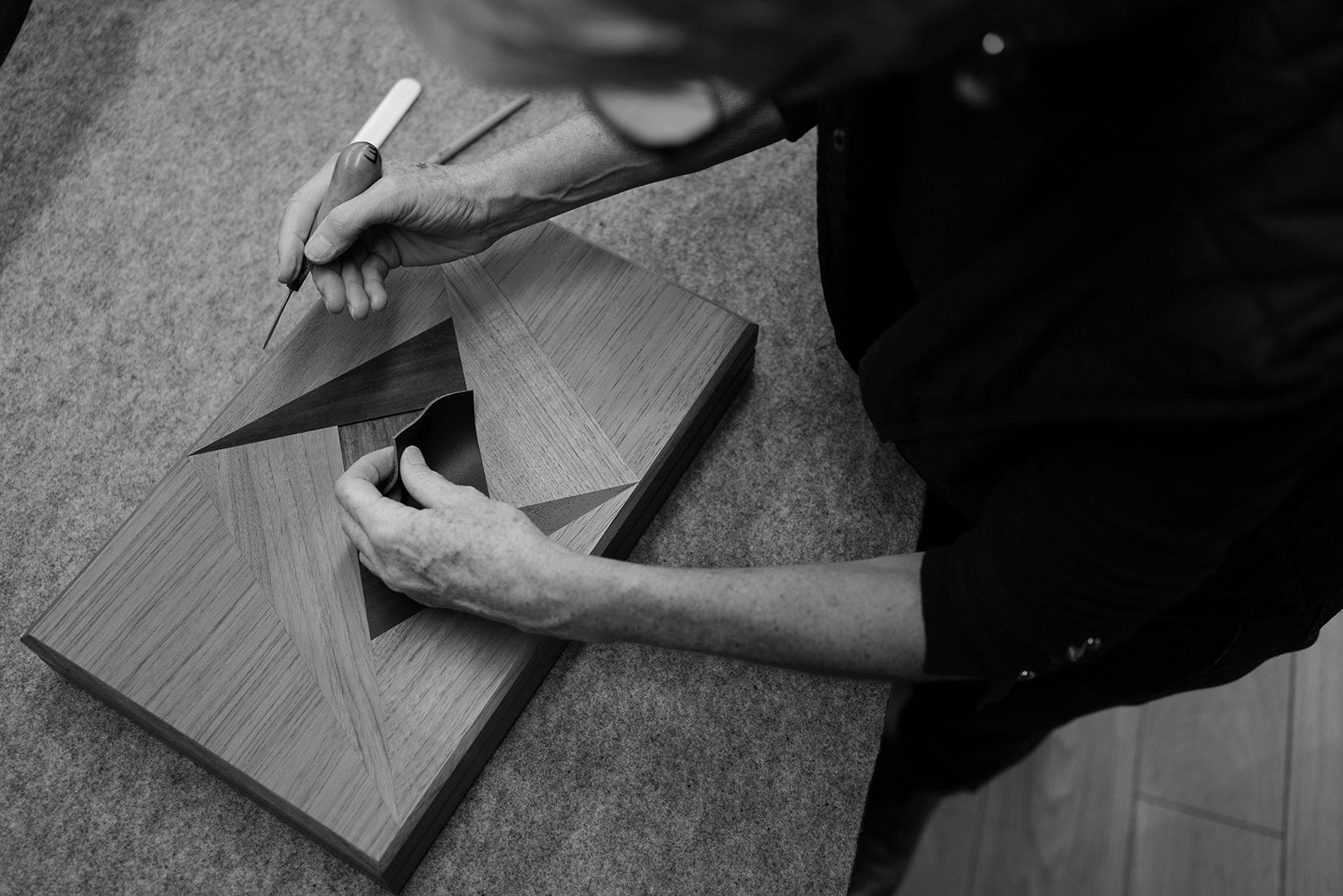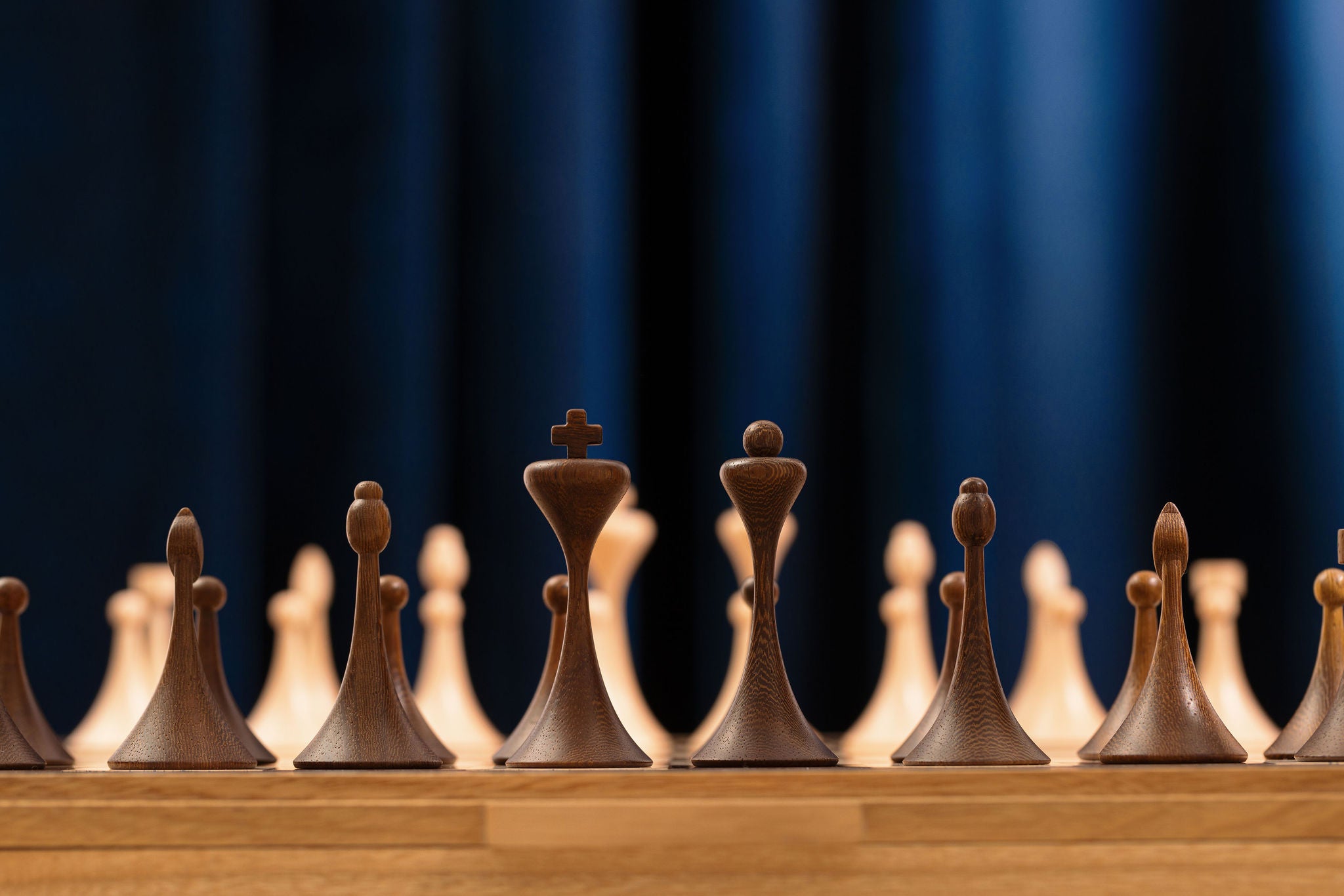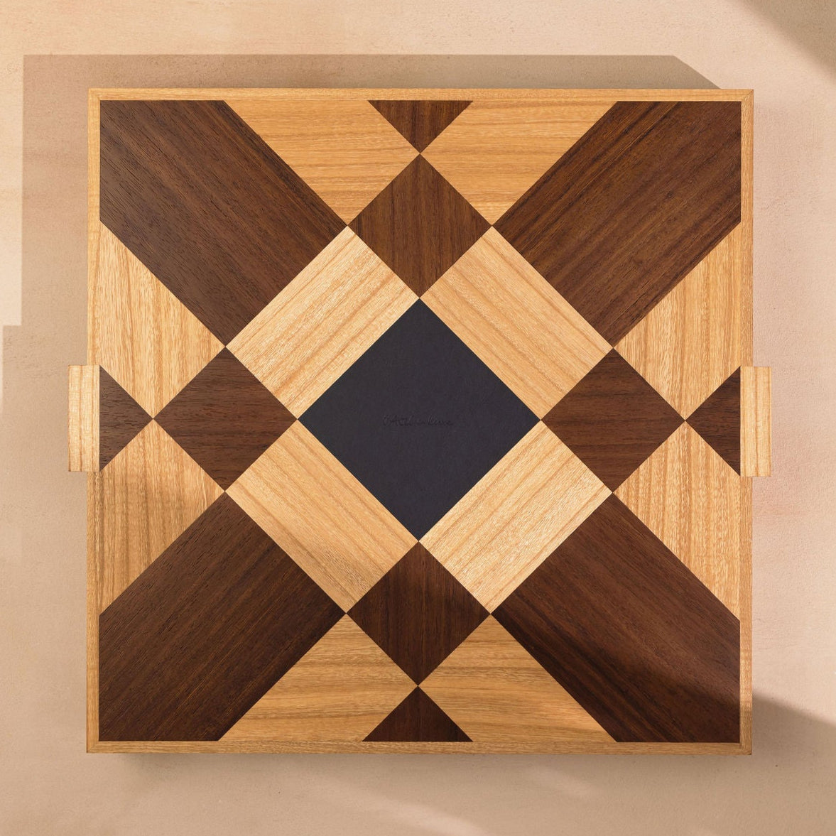 Ce jeu d’échecs conjugue design contemporain et savoir-faire artisanal. Sa structure en bois est sublimée par des détails raffinés tels que la marqueterie de bois, ainsi que le gainage en cuir et suédine réalisé dans nos ateliers. Les pions, façonnés à la main avec une grande finesse, apportent une élégance supplémentaire à cet objet intemporel.
